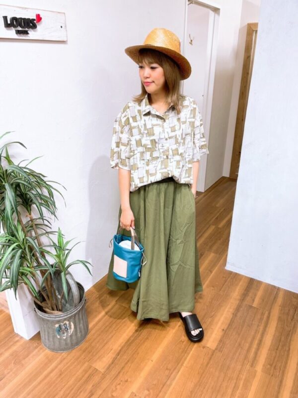 柄シャツのカラーとスカートのカラーを