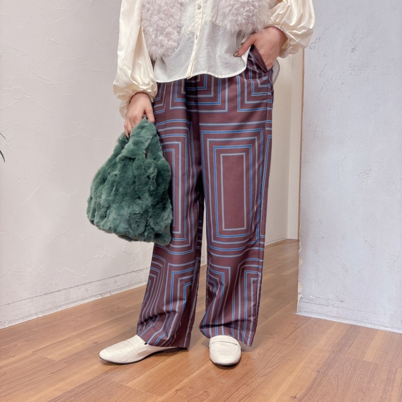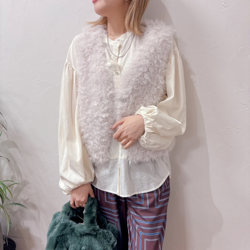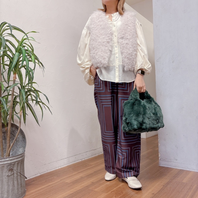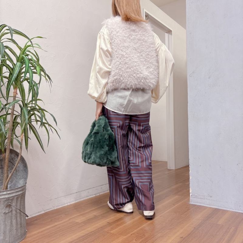 ふわふわとしたボリュームが可愛いベストを主役にしたコーデ。
