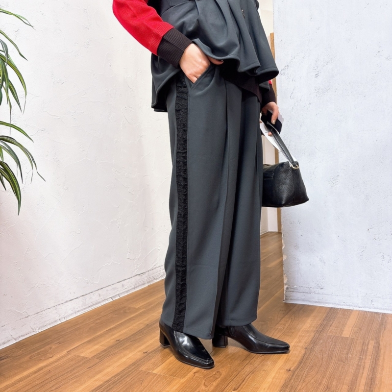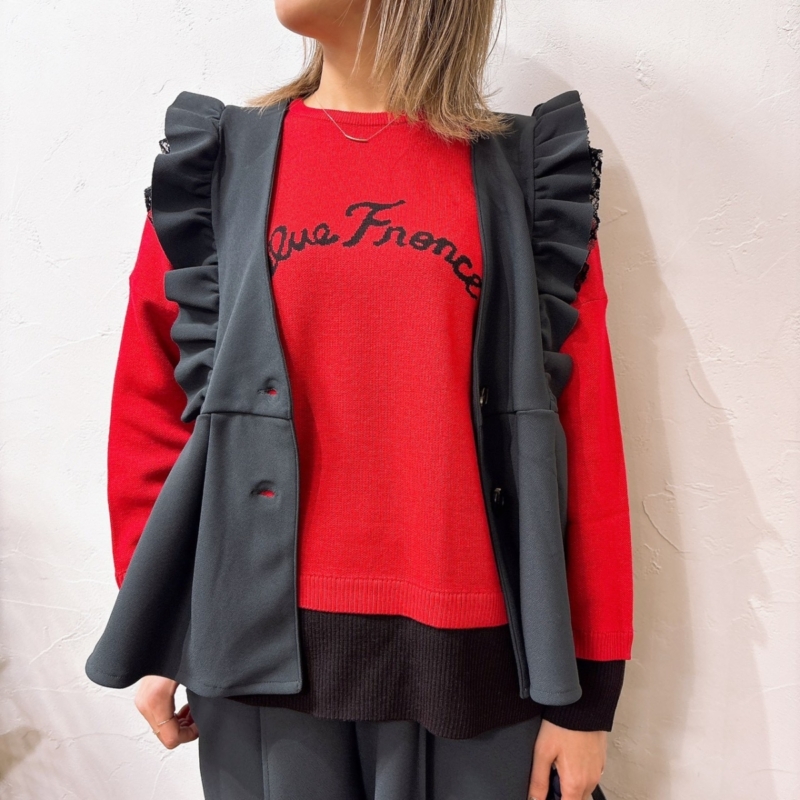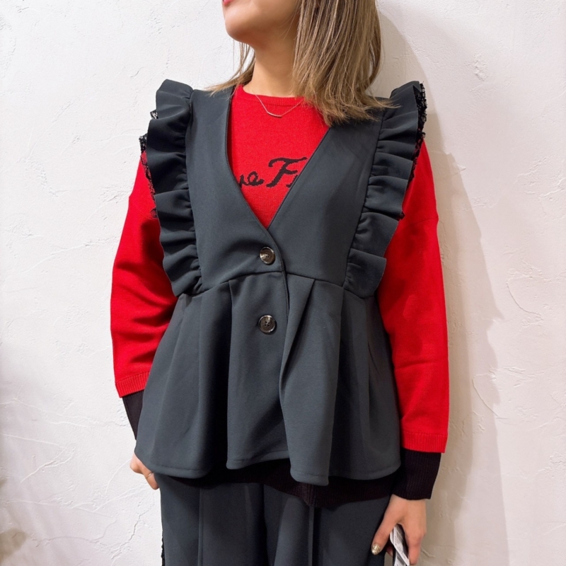 フリルデザインでありながら甘すぎず大人フェミニンな印象が叶うセットアップ。