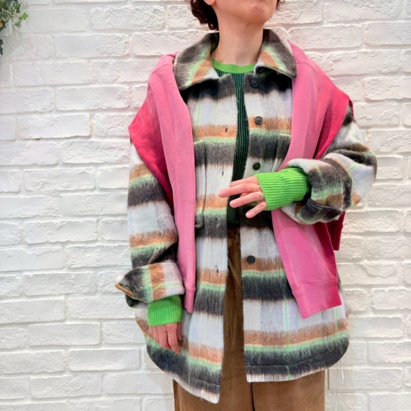 オーバーなチェックシャツはアウターっぽく