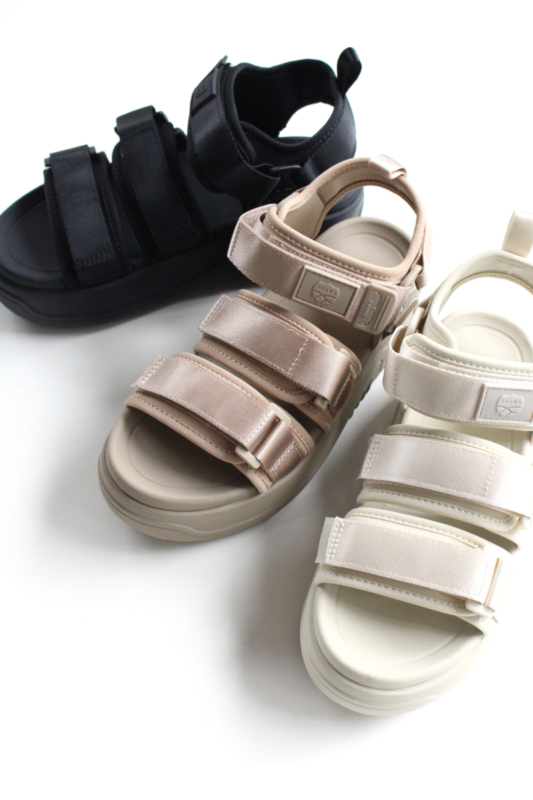 軽量EVA素材とロッカー構造の新ソールで、歩きやすさとトレンド感を兼ね備えています。大人気の定番サンダルを踏襲した着用者の足にフィット出来るアッパーデザインと、全体の色味に合わせた型押しラバーのブランドロゴラベルがシンプルかつモダンな印象に仕上がっています